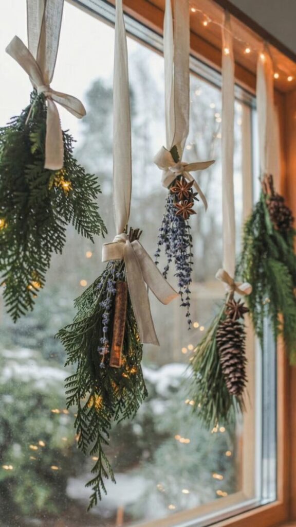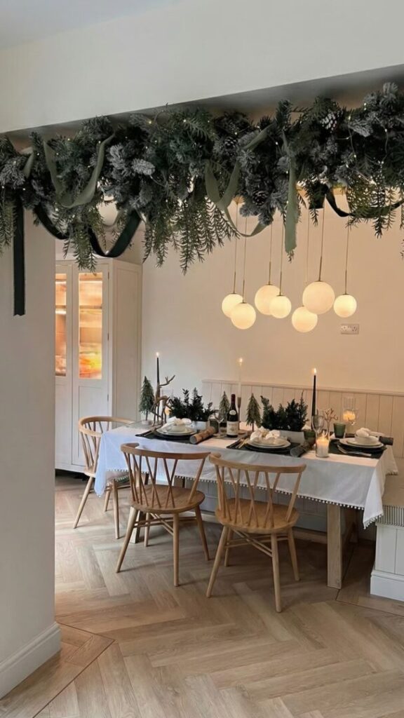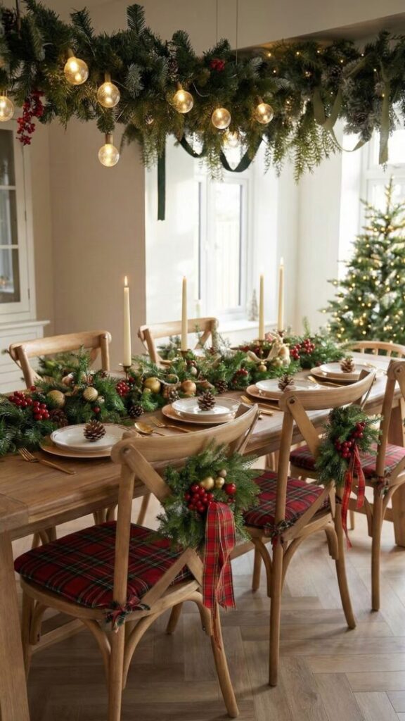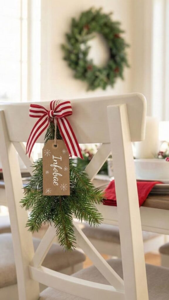 Aprovechar las sillas del comedor para la decoración es un gesto sencillo y sofisticado. Fijar mini coronas verdes en el respaldo con cintas de terciopelo o lazos de lino no solo embellece la mesa, sino que aporta un aire navideño distintivo. Personalizarlas con iniciales, campanas o ramas de eucalipto las hace aún más especiales.
