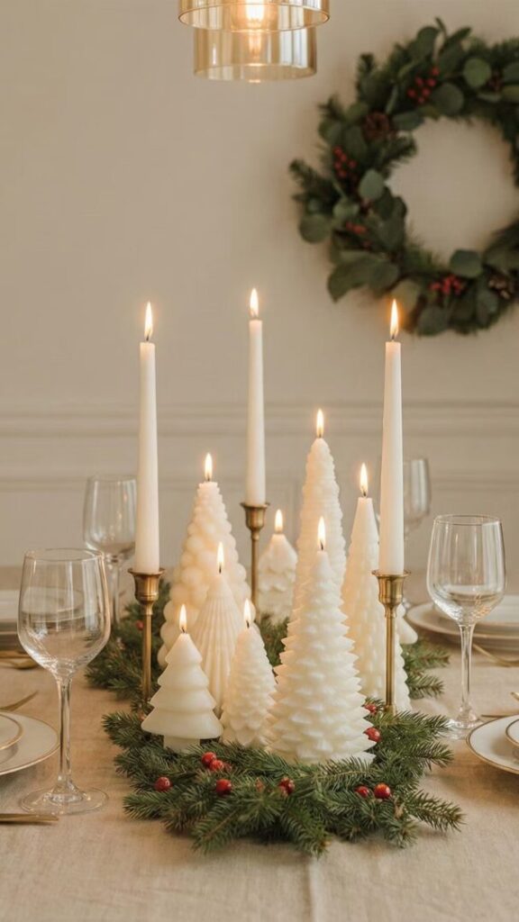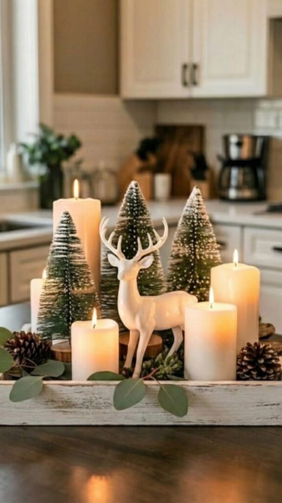 Al añadir velas, mini figuras y elementos verdes, se crea un microescenario navideño que puede trasladarse fácilmente de un espacio a otro, evitando la sobrecarga visual y manteniendo la armonía en la decoración.