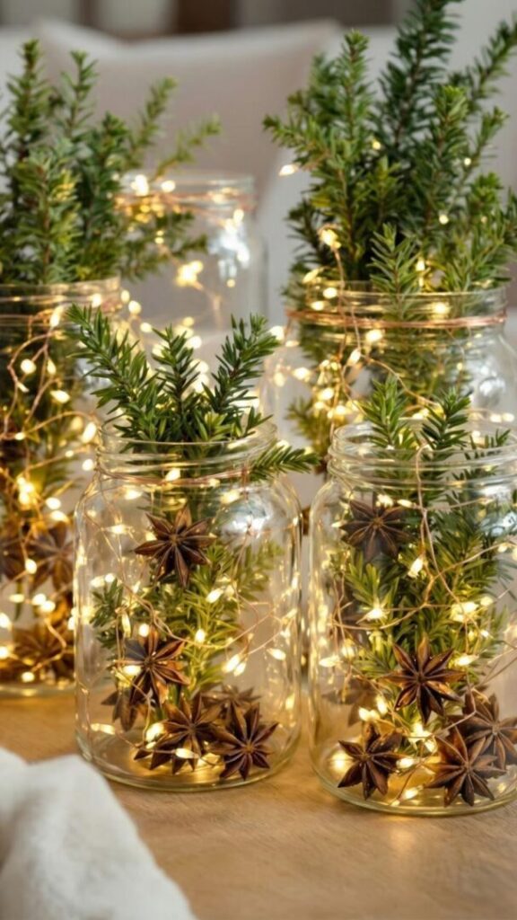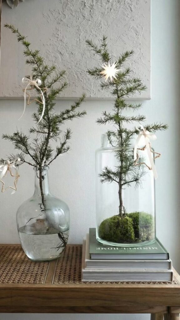 Para quienes prefieren evitar el árbol tradicional, decorar jarrones con ramas naturales ofrece una alternativa sencilla y vistosa. Un jarrón atractivo con ramas de eucalipto, pino o espigas doradas, acompañado de lucecitas, puede ubicarse en el recibidor, el living o el comedor, aportando un toque natural y festivo.