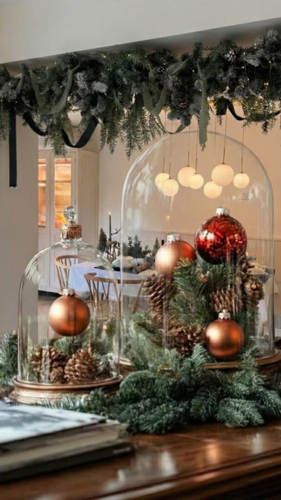 Los adornos dentro de campanas de cristal ofrecen una solución elegante y fácil de implementar. Colocar bolas de Navidad, figuras pequeñas, ramitas verdes o mini guirnaldas de luces en el interior de una campana convierte cualquier adorno sencillo en una pieza destacada, adecuada para el living, la entrada o la mesa del comedor.